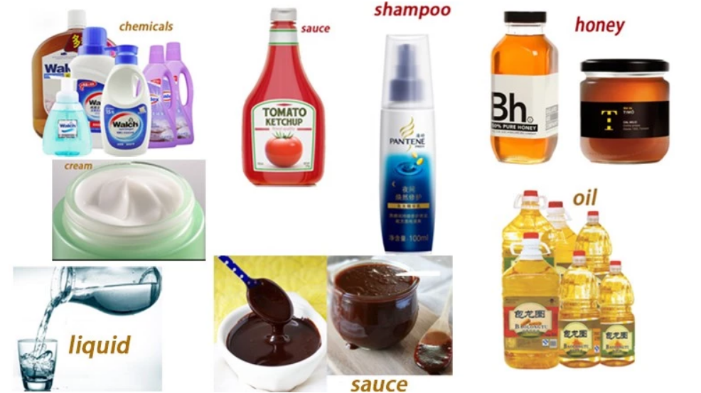 Polus viskozne i viskozne tekućine; mačka, senf, sirupi, salsa, majoneza, med, kikirikijev maslac, žele, umaci za potapanje, balzam za usne, šampon, gusti sapuni, gelovi za styling, maske za lice, vosak, ljepilo, masti, zaptivne mase, silikon i još mnogo toga