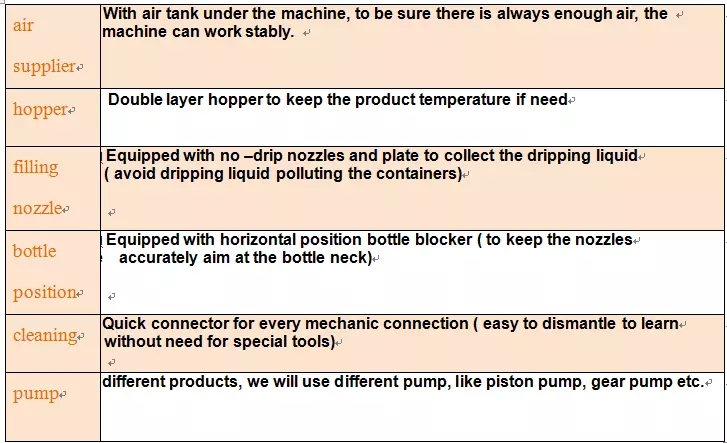 Ovaj stroj posebno je izrađen za sve vrste viskoznosti / tekućina u prehrambenoj industriji, kemijskoj industriji i sirovinama, kao što su motorno ulje, motorno ulje, salata, gel za pranje ruku, kokosovo ulje, sojin umak, sezam, šampon, tekući sapun, motorno ulje , kočiono ulje, ulje za kuhanje, umak od rajčice, napitak, esencijalno ulje, biljno ulje, med, sok od bibera, kikiriki maslac, jogurt, sok, napitak itd. Svi kontaktirani dio s tekućinom / umakom je visokokvalitetni nehrđajući čelik. Stroj prihvaća klipnu pumpu za punjenje. Podešavanjem položaja pumpe, može napuniti sve boce u jednoj stroju za punjenje, velikom brzinom i velikom preciznošću.