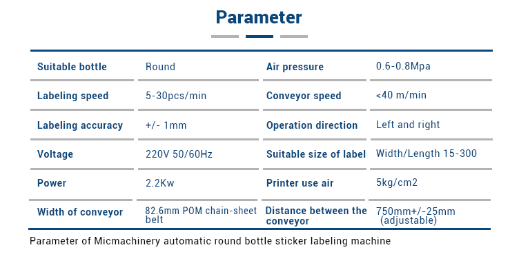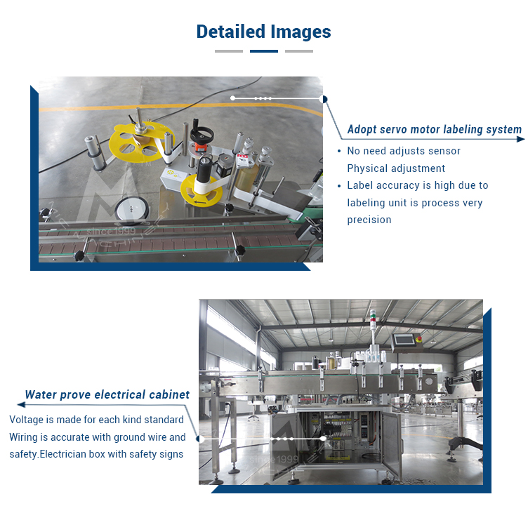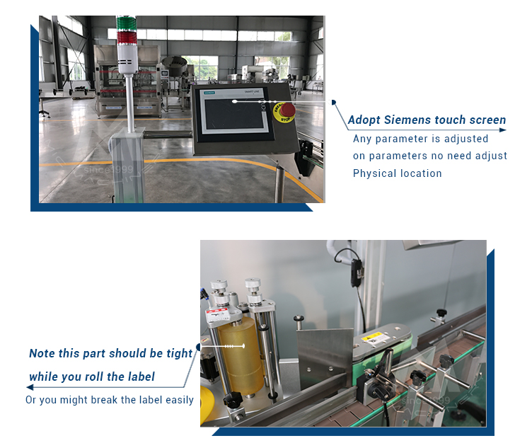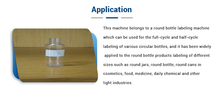 Ovaj stroj pripada stroju s okruglim bocama za etiketiranje koje se može koristiti za etiketiranje različitih kružnih boca tijekom cijelog ciklusa i polukruga, a široko se primjenjuje na etikete proizvoda s okruglim bocama različitih veličina, kao što su okrugle staklenke, okrugle boce , okrugle limenke za kozmetiku, hranu, lijekove, dnevnu kemijsku i drugu laganu industriju. Sastav opreme: električni ormar, transportni mehanizam, uređaj za odvojene boce, uređaj za naljepnicu, uređaj s naljepnicom četkica, motor s 1 oznakom, pogonski i upravljački sustav.
